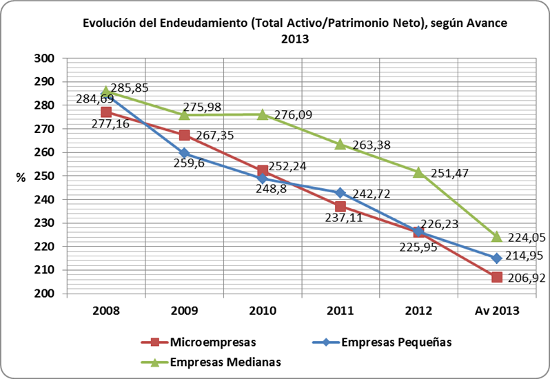En 2013 se rompe, por lo tanto, una deriva que desde 2007 había hecho caer la rentabilidad de los accionistas (ROE) entre 7 y 9 puntos porcentuales. En 2008 la rentabilidad financiera de las PYME ya había caído más de 4 puntos en las microempresas y más de 6 en las pequeñas y medianas. Posteriormente, la agudización de la crisis internacional en 2009 junto con la caída del consumo interno y la inversión en vivienda la redujo en un punto y medio adicional. Desde entonces las tendencias generales de la rentabilidad financiera fueron decrecientes hasta 2012.