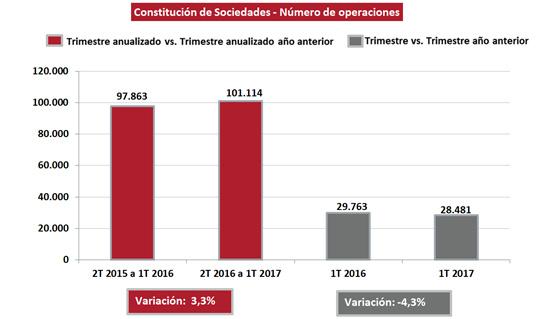 Según la estadística mercantil del Colegio de Registradores: http://www.registradores.org/portal-estadistico-registral/estadisticas-mercantiles/estadistica-mercantil/ en los últimos 12 meses, de abril de 2016 a marzo de 2017, se constituyeron 101.114 sociedades, un 3,3% más que en el mismo período acumulado del año anterior. La creación de empresas continúa por encima de las 100.000 operaciones anuales, lejos de las casi 150.000 que se registraron en máximos históricos en 2006.