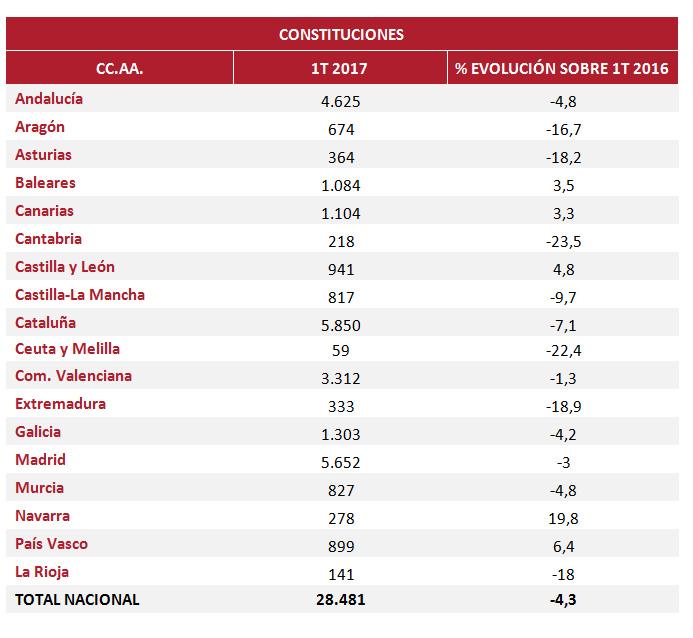17.04.’17.- En el primer trimestre se constituyeron en España 28.481 sociedades mercantiles, un 4,3% menos que en el mismo trimestre de 2016, un descenso similar al del trimestre anterior, cuando disminuyó el 4,1% sobre el mismo período del año anterior, acumulando por tanto dos trimestres consecutivos de descensos interanuales.