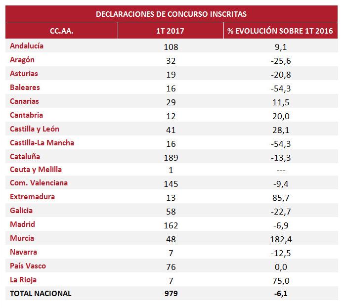 Las empresas con serias dificultades financieras, que se vieron inmersas en concurso de acreedores entre enero y marzo fueron 979, un 6,1% menos que en el primer trimestre de 2016, continuando la tendencia de los últimos dos años, aunque moderando claramente su intensidad.