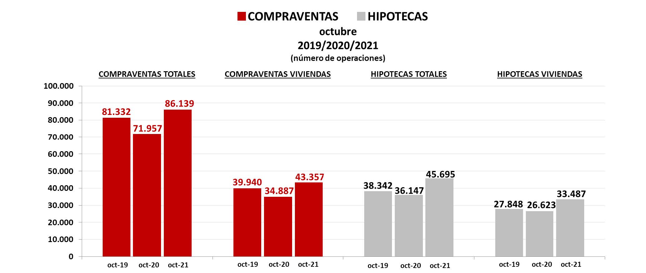 En octubre, el número de compraventas totales se ha incrementado un 19,7% respecto a octubre de 2020. De las 71.597 operaciones realizadas en octubre de 2020, se pasaron a las 86.139 en octubre de este año, un aumento de cerca de 14.600 operaciones. Con relación al mes de octubre de 2019, en el que se registraron 81.332 operaciones, se constata un incremento más moderado del 5,9%, cifra más significativa al tratarse de un mes en circunstancias de ciclo económico normal.