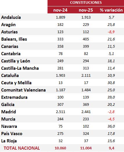 Durante el mes de noviembre se han creado 11.004 nuevas empresas en España, frente a las 10.060 registradas en el mismo mes de 2024. Con este resultado, se encadenan siete meses consecutivos de crecimiento interanual, tras cuatro de caídas de enero a abril. El mayor repunte se produjo en mayo, con un incremento del 35,9%, mientras que en los meses posteriores se mantuvieron tasas positivas, aunque más moderadas, alcanzando en noviembre el 9,4 %.