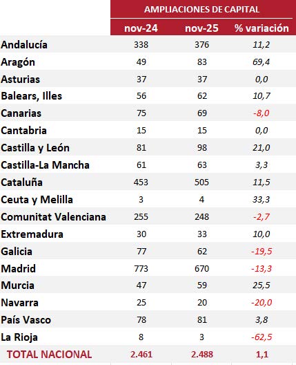 Las operaciones de ampliación de capital reflejan la confianza empresarial en la solidez de su proyecto y las expectativas sobre su evolución y la del propio mercado. En los últimos meses se aprecia una evolución favorable al compararlo con la situación un año antes; los incrementos son generalizados. En noviembre, 2.488 empresas han realizado una ampliación de capital, un 1,1% más que en noviembre de 2024, manteniendo esa tendencia positiva.