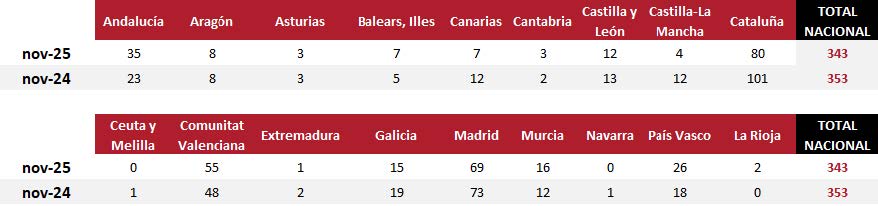 Durante el mes de noviembre se han inscrito 343 concursos de acreedores en los Registros Mercantiles, lo que representa un descenso del 2,8 % frente al mismo mes de 2024, cuando se registraron 353 concursos. Las Comunidades de Cataluña, Comunitat Valenciana y Madrid, en conjunto, y como corresponde a su actividad económica, agrupan seis de cada diez concursos registrados en este mes.